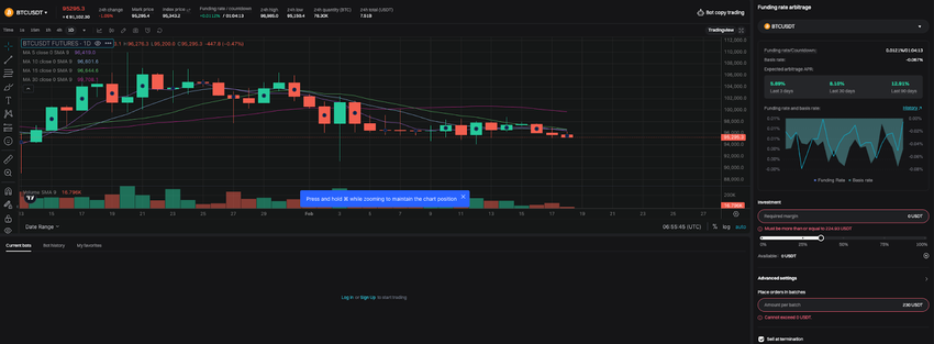 Wann du ihn nutzen solltest: Setze den Funding Rate Arbitrage Bot ein, wenn es einen signifikanten Unterschied in den Funding Rates zwischen Spot- und Futures-Märkten gibt, sodass du konsistente Renditen mit minimaler Marktexposition erzielen kannst.