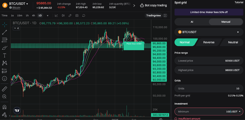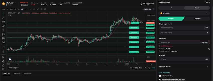 Wann du ihn nutzen solltest: Verwende den Spot Grid Bot in Seitwärtsmärkten, in denen die Preise innerhalb eines vorhersehbaren Bereichs auf und ab schwanken. Er funktioniert am besten, wenn es keinen klaren Trend gibt – weder zu bullisch noch zu bärisch – und hilft dir, von häufigen Preisschwankungen zu profitieren.