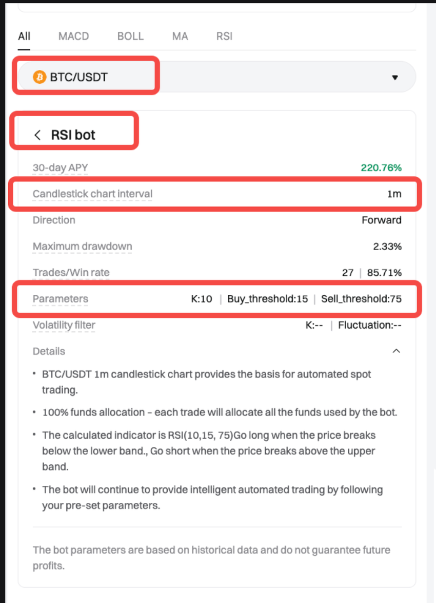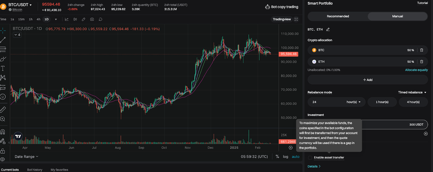 Wann du ihn nutzen solltest: Verwende den Smart Portfolio Bot, wenn du mehrere Kryptowährungen hältst und eine ausgewogene Allokation beibehalten möchtest, ohne die Bestände manuell anpassen zu müssen. Er ist nützlich für langfristige Anleger, die ein diversifiziertes Portfolio verwalten.