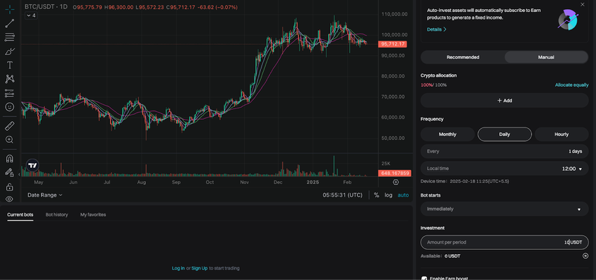 Wann du ihn nutzen solltest: Verwende den Spot Auto-Invest Bot, wenn du Krypto über die Zeit ansammeln möchtest, ohne dich um kurzfristige Preisschwankungen zu kümmern. Er ist ideal für langfristige Anleger, die ihr Portfolio kontinuierlich aufbauen möchten.