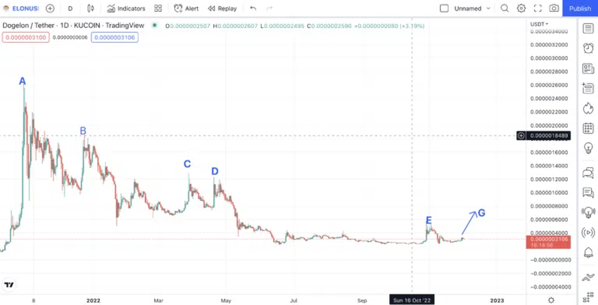 Wenn du genau hinsiehst, wirst du feststellen, dass es mit E bereits eine Top-Formation gibt. Der ELON Coin bildet einen Boden und wölbt sich in Richtung eines neuen Hochs (G), um die Doppel-Top-Formation zu vervollständigen.