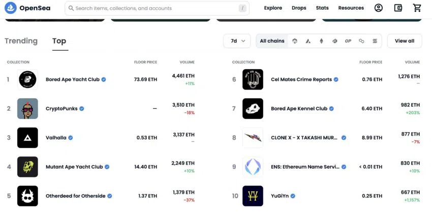 Hier ist eine OpenSea-Statistik mit den wichtigsten NFT-Sammlungen nach Volumen von einer Woche. Beachte, dass die Domains auf dieser Liste hier den neunten Platz einnimmt. Auf der 30-Tage-Liste steht es sogar an siebter Stelle.
