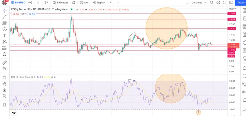 - Die Preise des ENS Token reagieren gut auf Divergenzen. Hier ist eine bärische Divergenz zu sehen, bei der der RSI niedrigere Höchststände und der Kurs höhere Höchststände erreichte. Kurz darauf kam es zu einer Kurskorrektur.