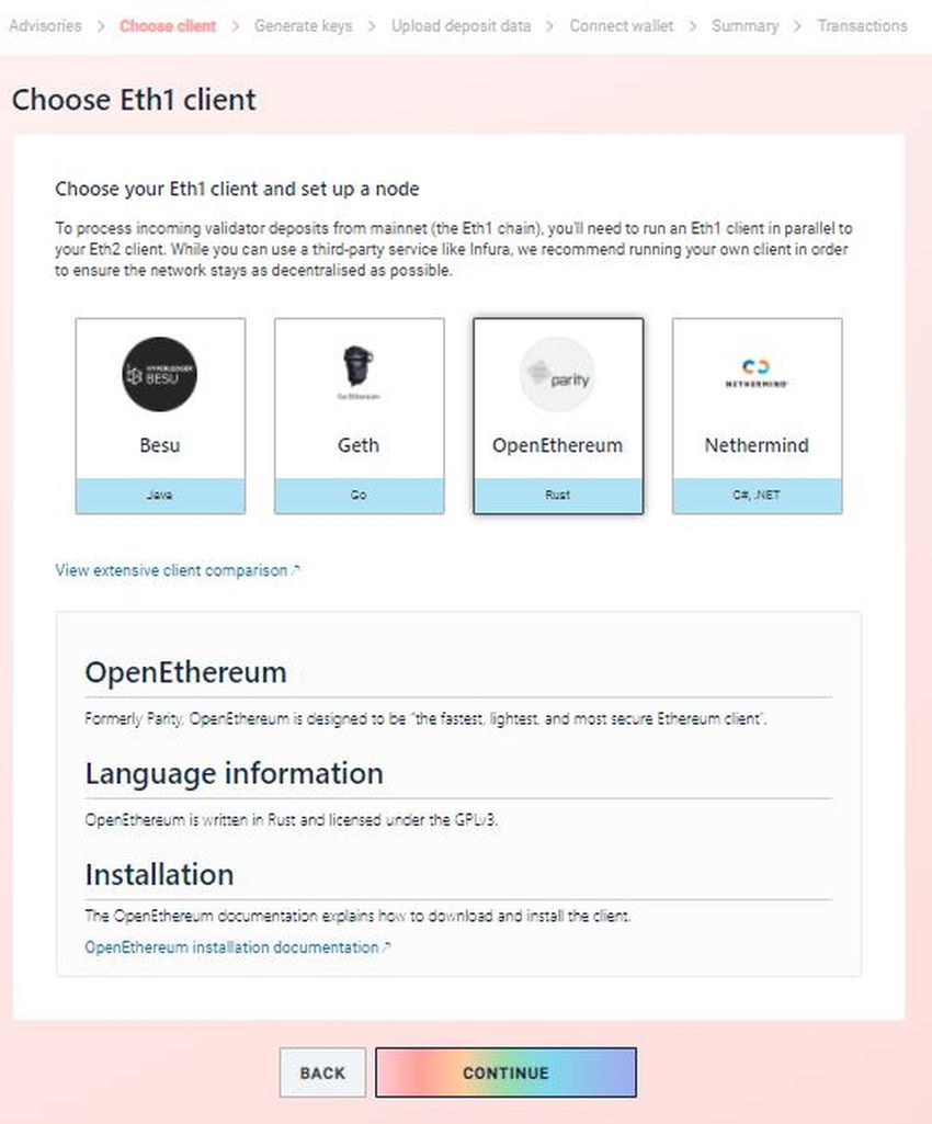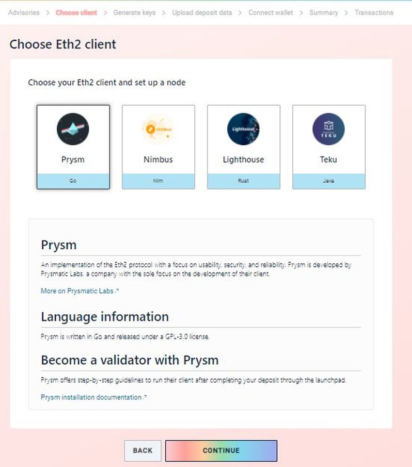 Nachdem du alle Bedingungen akzeptiert hast, kannst du deine gewünschten ETH1- und ETH2-Clients auswählen, um deinen Node einzurichten.