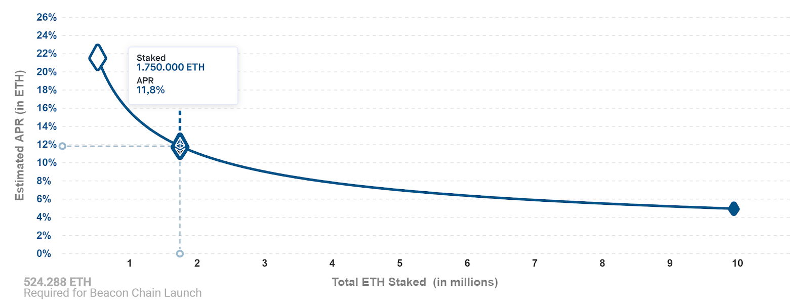 Je mehr Validator:innen – oder Teilnehmer:innen am Staking – desto niedriger der APY. Je mehr Nutzer die Blockchain benutzen, umso mehr Gebühren fallen an, von welchen ein Teil ebenfalls an die Validator:innen ausgeschüttet wird. Laut dem Ethereum Staking Calculator von Staking Rewards liegt die aktuelle Vergütung bei 4,64 % APY (Annual Percentage Yield) der gestakten ETH.