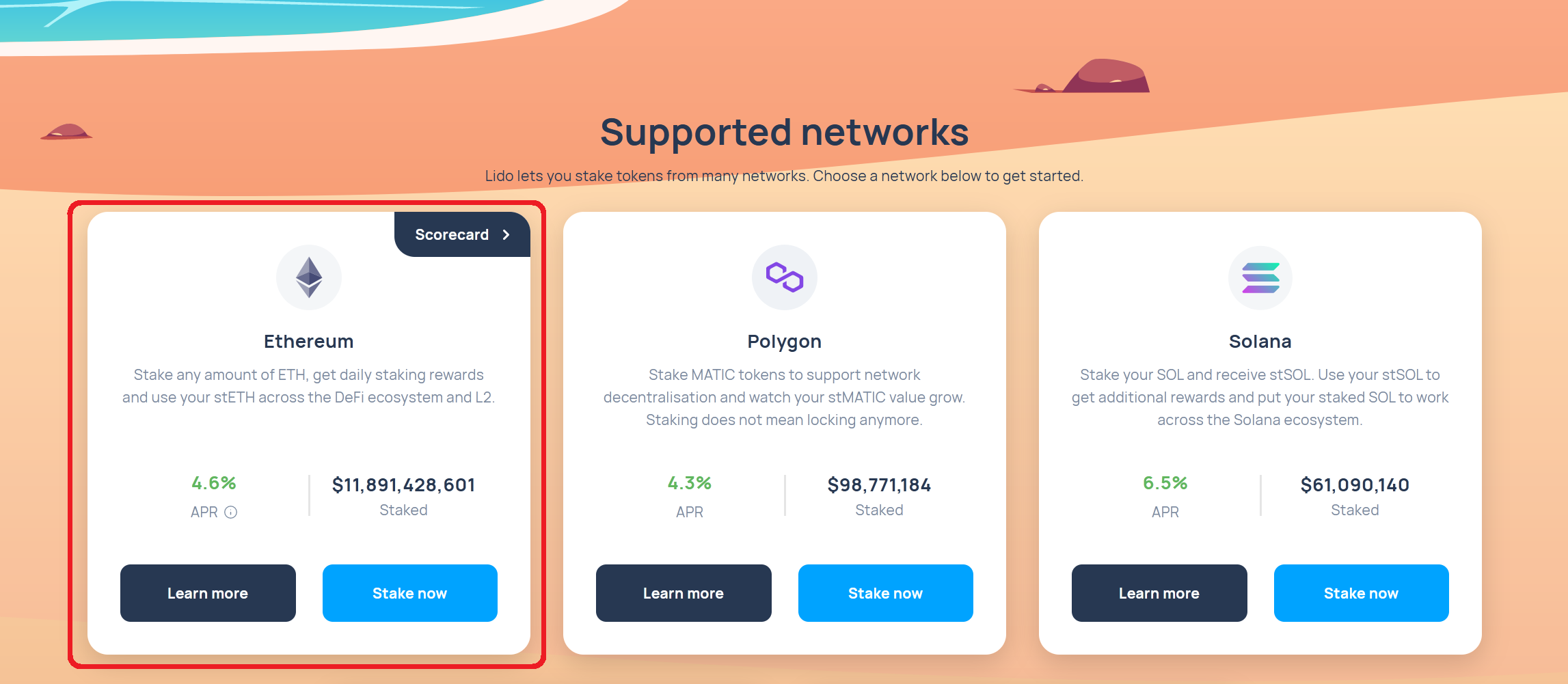 Wenn du mit Lido stakest, erhälts du stETH-Token, die im Verhältnis 1:1 zum anfänglichen Einsatz ausgegeben werden. Dein stETH-Guthaben kann wie reguläres ETH verwendet werden, um Belohnungen zu erhalten. Das Guthaben wird täglich aktualisiert, um die Staking-Belohnungen von ETH widerzuspiegeln. Bei Lido gibt es keine Mindesteinlagen oder Sperrfristen und aktuell erhälst du laut Angaben auf der Website 4,6 % APY.