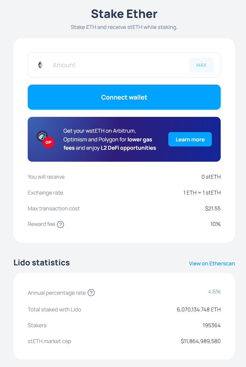 Lido Finance ist ein etablierter Anbieter und derzeitiger Marktführer für Liquid Ethereum Staking. Verbinde deine Wallet, mit den ETH die du staken willst, mit Lido und gib den gewünschten Betrag in die Dapp ein. Lido bietet dir eine benutzerfreundliche Oberfläche und laut eigenen Angaben eine hohe Liquidität sowie eine sichere Infrastruktur.