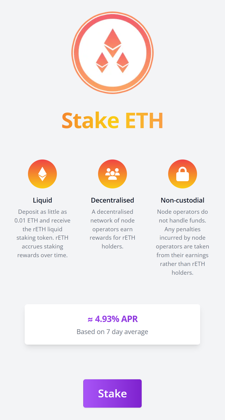 Ein weiterer bekannter Anbieter für Liquid Staking ist Rocket Pool. Hier gibt es einen aktuellen APY von 4,93 %, basierend auf einem Durchschnitt der letzten 7 Tagen. Auch hier verbindest du einfach dein Wallet mit deinen ETH, die du staken möchtest, mit dem Protokoll, rufst das Interface für ETH Staking auf und stakst die gewünschte Anzahl an ETH. Auch hier gibt es keine Mindestlaufzeit oder feste Sperrfrist.