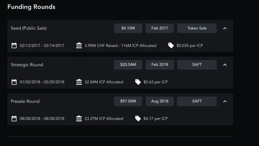Hier siehst du, wie die drei Finanzierungsrunden für ICP abgelaufen sind: