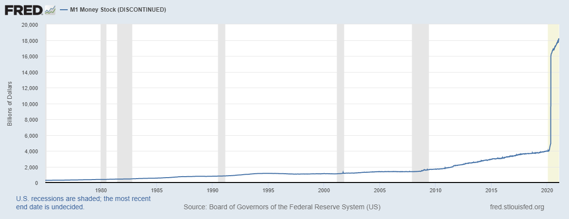 Natürlich darf man den größten Treiber des Bitcoin-Kurses nicht unerwähnt lassen – die Federal Reserve. Während des letzten Jahres ist die Gelddruckmaschine der Fed in den Overdrive gegangen. Manche schätzen, dass in einem Monat etwa ein Viertel aller Dollars gedruckt wurde, mehr als in zwei Jahrhunderten. Dies entwertet den Dollar massiv, was wahrscheinlich zu einer (Hyper-)Inflation führen wird.