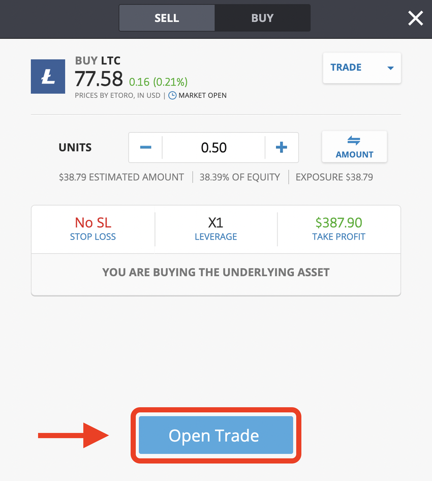 Denk daran, dass es einen Unterschied zwischen “Handel” (Market) und “Bestellung” (Limit) gibt. Wenn du dich für den Kauf von Litecoin über die Option “Handel” entscheidest, wird, wie oben erwähnt, dein Kauf sofort ausgeführt. Du wirst dann auch deine neuen Litecoin sofort in deinem Portfolio reflektiert sehen (es sei denn, du hast sie mit der eToro App auf ein separates Litecoin Wallet verlegt).