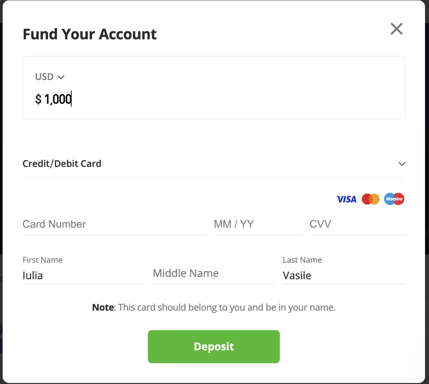 Das Wichtigste zuerst: Melde dich mit deinem eToro-Konto an. Dann geh auf die spezielle Seite, um dein Konto aufzufüllen, bevor du Litecoin (LTC) kaufst. Du kannst nun deine Kreditkarten- oder Debitkartendetails eingeben.