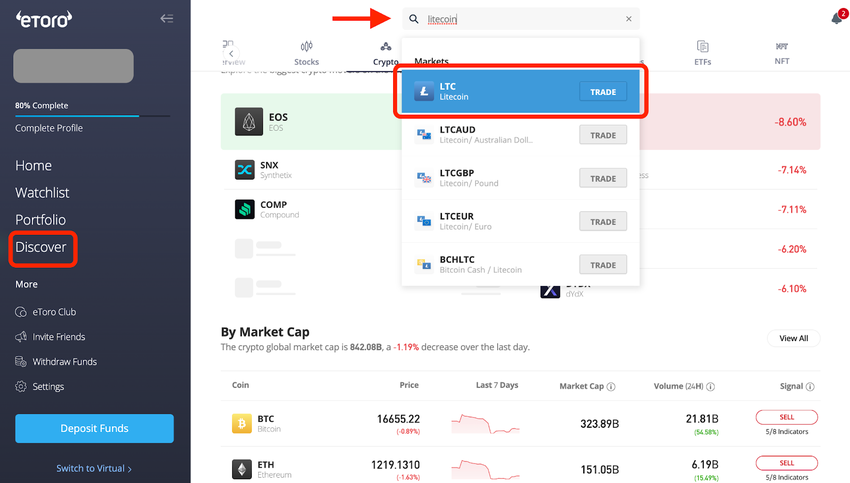 Hier sind die Schritte, die du befolgen musst, um Litecoin auf eToro zu kaufen, nachdem du dich dort angemeldet hast.