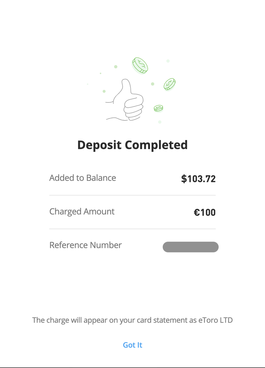 Sobald du alle deine Daten eingegeben hast, kannst du auf die Schaltfläche “Deposit” (Einzahlen) klicken. Wenn deine Einzahlung erfolgreich war, erhälst du die folgende Meldung: