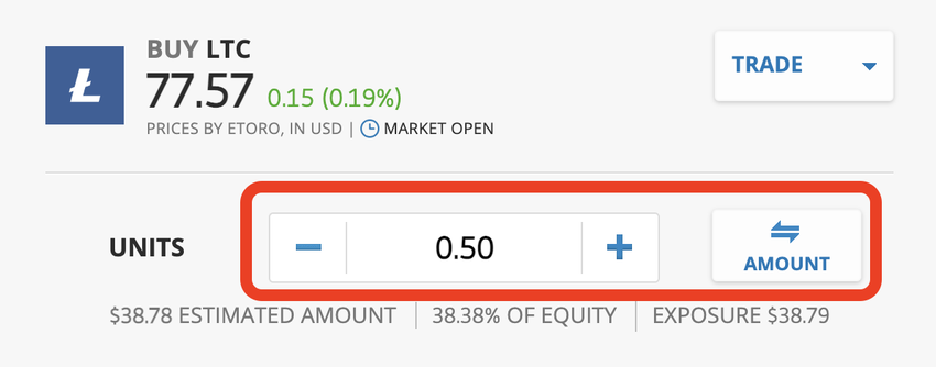 Siehst du die Schaltfläche “UNITS” (Einheiten)? Hier kannst du die genaue Menge der Kryptowährung eingeben, die du kaufen möchtest, in diesem Fall ein halber Litecoin.