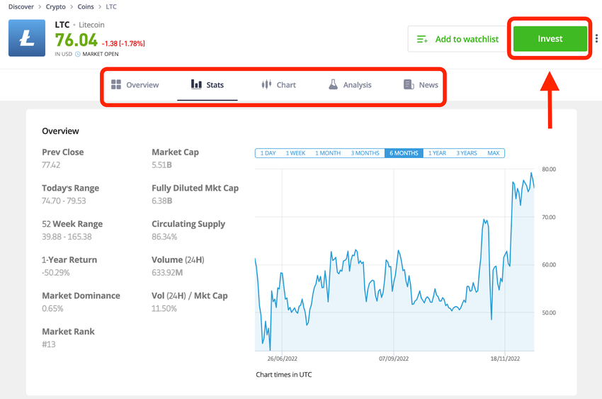 eToro bietet außerdem Statistiken, Charts, Analysen und Nachrichten zu den jeweiligen Währungen (sowohl Fiat als auch Krypto). Unter den News findest du alles, was du über LTC als Asset wissen solltest. Wenn du bereit bist, Litecoin zu kaufen, klicke auf “Trade” und dann “Invest” (Handeln/Investieren).