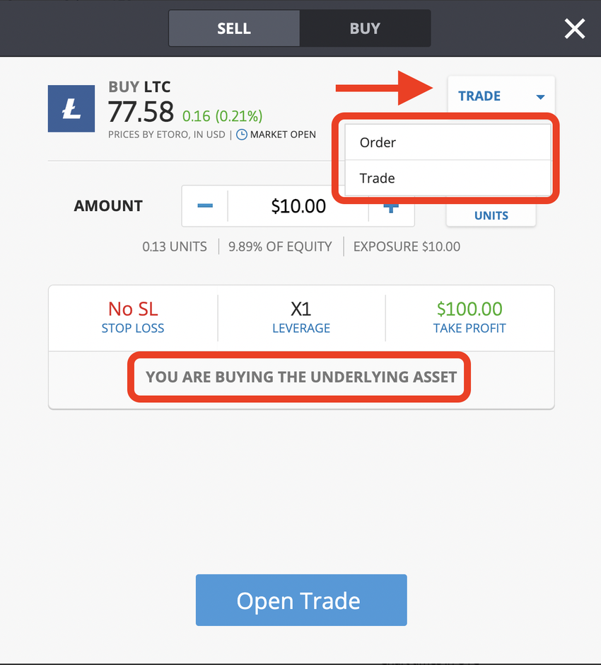 Obwohl dieses Fenster einfach erscheint, gibt es ein paar Dinge, die wir dir hier erklären müssen. Beachte unbedingt, dass eToro eine Handelsplattform ist. Es ist keine Kryptobörse per se. Etoro ermöglicht es dir jedoch, den zugrunde liegenden Vermögenswert, in diesem Fall Krypto, zu kaufen.