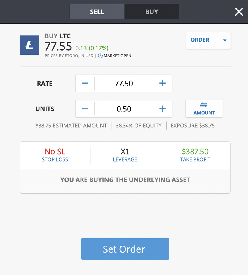 Um eine Bestellung aufzugeben, gib den Preis ein, zu dem du Litecoin kaufen möchtest. Das ist dein “Kurs”. Da es sich bei digitalen Währungen in der Regel um Bruchteile handelt (z.B. 0.001 Bitcoin) kannst du auch weniger als eine ganze Einheit kaufen (ähnlich wie bei Aktien auch). Siehe das Beispiel unten. Etoro ermöglicht es dir auch, den Betrag entweder in Fiat-Währung (in US-Dollar oder Euro) oder in Einheiten des zu kaufenden Wertes anzuzeigen (in diesem Fall LTC).