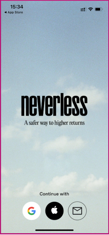 Die Anmeldung bei Neverless ist super schnell und unkompliziert. Du kannst dies entweder direkt über die Website oder über die App erledigen. Wir nutzen in diesem Test die App und verwenden daher auch die entsprechenden Screenshots.