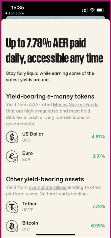 Das breit gefächerte Angebot umfasst über 460 verschiedene Kryptowährungen, welche einfach über den “Exhcange”-Button zu kaufen sind. Hier kommt nun die Besonderheit der Plattform zum Vorschein: Auf bestimmte Token erhältst du automatisch Rendite – auf Bitcoin und USDT sogar bis zu 7,5 Prozent.