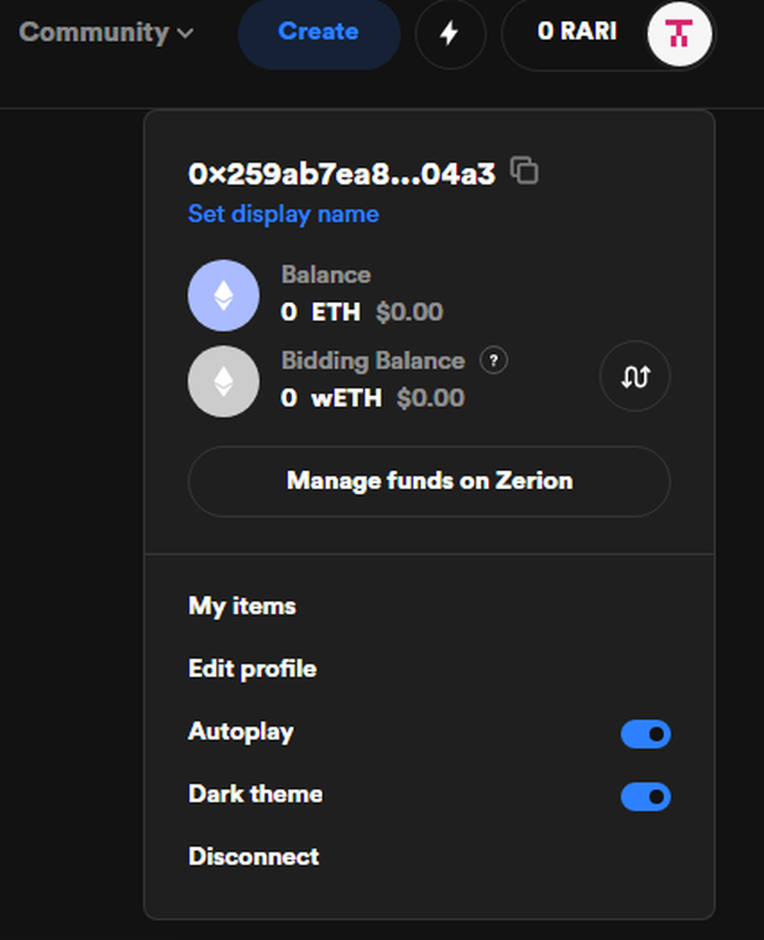 Mit einem Klick auf das Menü oben rechts öffnet sich ein Fenster mit einer Liste von Wallets, aus denen du eine auswählen kannst. Da du die MetaMask-Wallet bereits installiert hast, wählst du diese aus. Wenn du nun auf das Symbol oben rechts klickst, siehst du deine ETH- und RARI-Token-Guthaben.