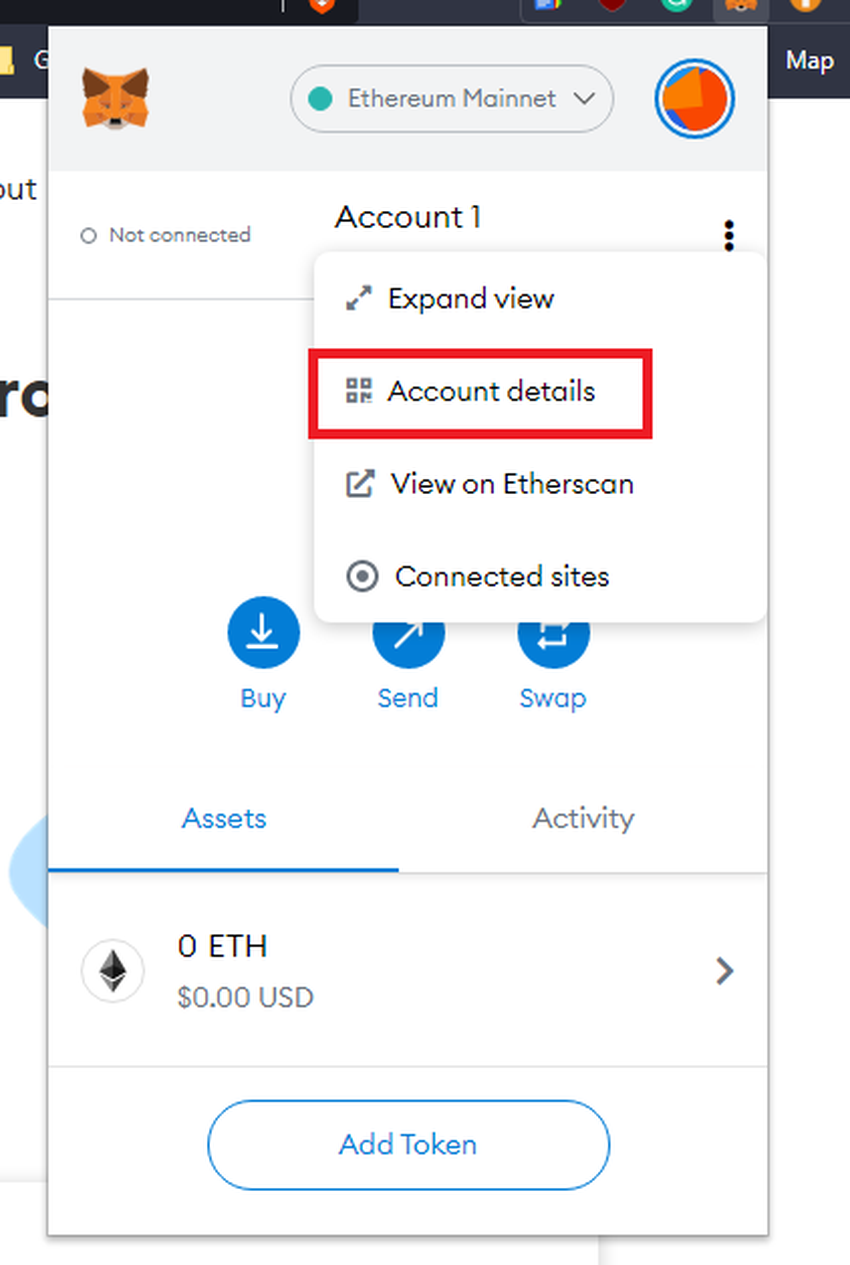 Durch Klicken auf die Schaltfläche „Konto anzeigen“ werden die Adresse und der QR-Code deiner MetaMask geöffnet. Verwende diese Informationen, um ETH von deiner Krypto-Börse zu transferieren. Das war’s! Jetzt hast du ETH auf deiner MetaMask-Wallet und kannst dich mit Hunderten von dApps verbinden.
