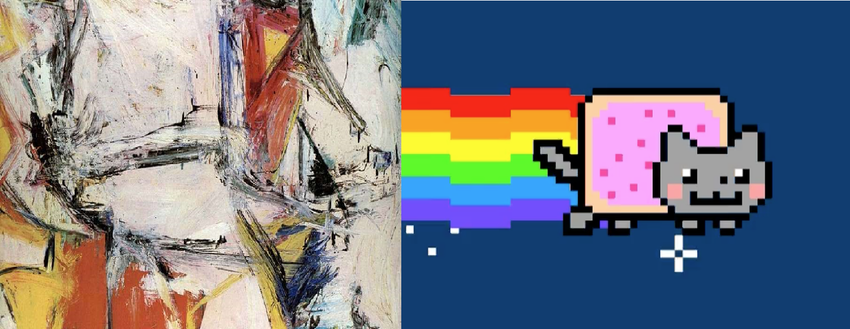 Um zu verstehen, was NFTs sind, vergleichen wir sie mit traditonellen Kunstwerken. Zum Beispiel können die teuersten und bekanntesten Kunstwerke wie Mona Lisa oder Interchange von Willem de Kooning genauso reproduziert werden wie NFTs. Genauer gesagt, hier ist ein Interchange-Gemälde im Wert von 300 Millionen US-Dollar. Daneben steht Nyan Cat NFT von Chris Torres, das zu dieser Zeit für etwa 600.000 US-Dollar (300 ETH) verkauft wurde. Beide sind direkt auf deinem Bildschirm sichtbar, was bedeutet, dass du sie so sehen kannst, wie auch der Käufer.
