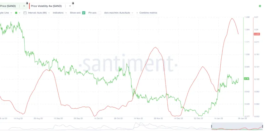 Als Investor sieht das nächste Diagramm nicht besonders optimistisch aus. Die 4-Wochen-Volatilität im Januar 2023 stieg an, ebenso wie die Preise. Und die historischen Daten zeigen, dass jedes Mal, wenn die Volatilität ihren Höhepunkt erreichte, die Preise von SAND korrigierten. Die Preise von SAND korrigierten sich etwas, bevor sie sich dem neuen Hoch von 2023 näherten.