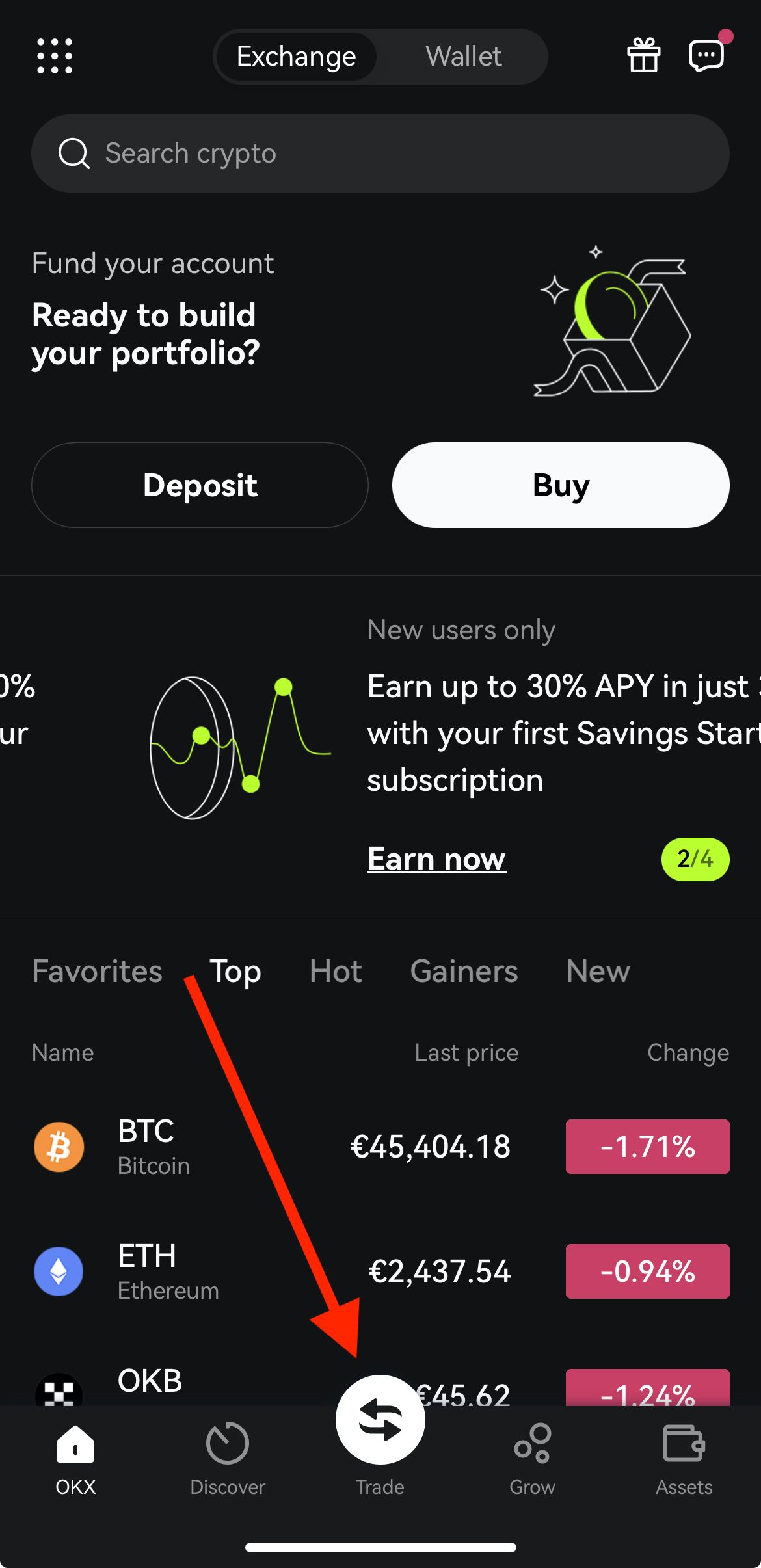 Schritt 2: Nachdem du dein Konto verifiziert und deine erste Einzahlung getätigt hast, klicke in der App auf den mittleren Button “Trade”.