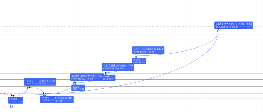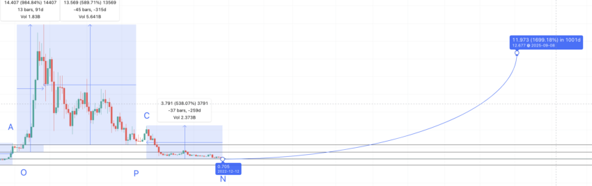 Einem Grayscale-Bericht zufolge dauert es fast 1.177 Tage ab dem Tief des Bärenmarktes, bis das Allzeithoch des letzten Bullenmarktes wieder erreicht ist. Gemäß der Kursanalyse könnte es daher mehr als drei Jahre dauern, um von N auf das vorherige Hoch bei B zu gelangen (über 2.000 %). Makrotrends zufolge könnte der Token in 2025 12,67 US-Dollar erreichen. Wir gehen von einem potenziellen Anstieg von 1.696,27 % nach 1.000 Tagen aus.