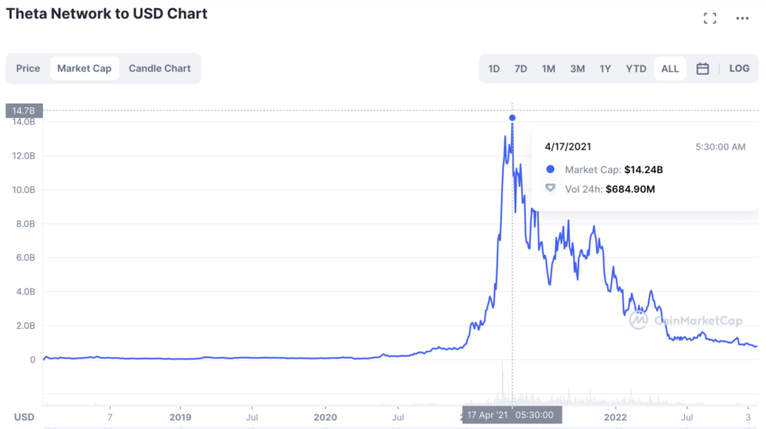 THETAs Marktkapitalisierung erreichte im April 2021 ein Hoch von 14,24 Milliarden US-Dollar mit einem Handelsvolumen von 684,90 Millionen US-Dollar. Damit liegt das Umsatzverhältnis (Handelsvolumen zu Marktkapitalisierung) bei 0,048 US-Dollar.