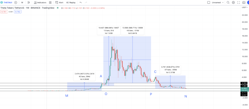 Das größere Muster zeigt einen Tiefpunkt bei M zum Handelsbeginn von Theta Coin. Anschließend folgt ein Hoch bei A, ein Tief bei O und weiteres Hoch bei B. Danach fiel der Kurs auf P, erreichte ein Hoch bei C und schließlich wieder ein Tief bei N, wo wir den jüngsten Boden vermuten.