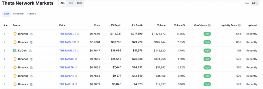 Die Münze verfügt seit Dezember 2022 über einen relativ robusten Spot-Handelsmarkt-Spread, wobei das THETA-USDT-Paar das größte Volumen aufweist. Die Liquidität an den Börsen ist ebenfalls ordentlich. Dies steht für eine positive Stimmung der Marktteilnehmer und könnte einige der negativen Auswirkungen der Volatilität ausgleichen.