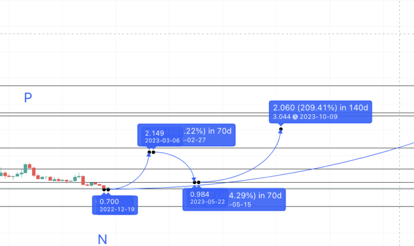 Die Daten des vorherigen Segments setzen das Hoch und Tief im Jahr 2023 auf 2,149 USD und 0,968 USD. Von diesem Tief aus können wir eine weitere Prognoselinie ziehen und auf 140 Tage und 208,60 % ausweiten. Insgesamt deutet das 2023 auf ein weiteres Hoch bei 3,00 US-Dollar hin.