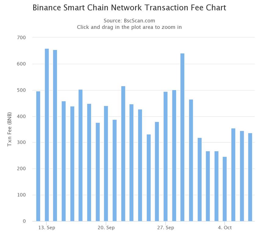 Die täglichen Transaktionsgebühren im Binance Smart Chain (BSC) Netzwerk betragen $146.550 (336 BNB, 1 BNB = $436,16) pro Tag.