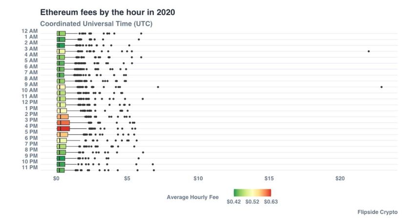 Anhand der Untersuchungen von Flipside Crypto lässt sich bei einer stündlichen Darstellung der Ethereum-Transaktionen leicht erkennen, wann die meisten Transaktionen auf Ethereum durchgeführt werden. Das obige Diagramm zeigt die durchschnittlichen Gebühren im Jahr 2020, wobei die Balken auf den Durchschnittswert zeigen und die schwarzen Punkte Ausreißer darstellen.