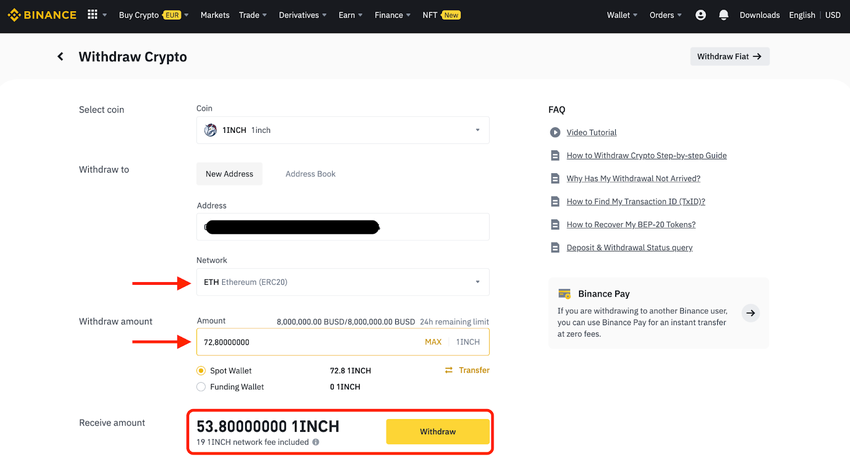 1. 1INCH-Token an deine private Wallet senden