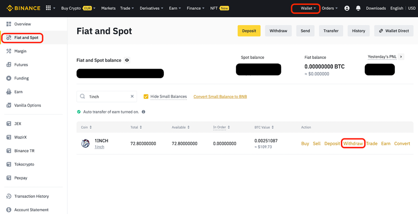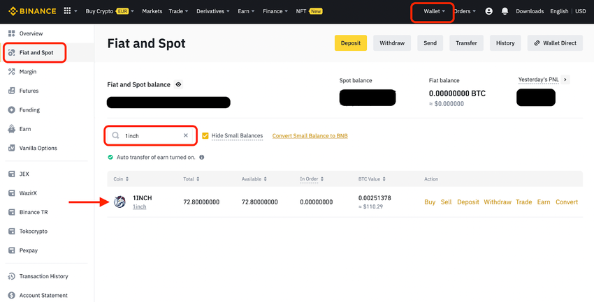 Gehe auf Wallet > Fiat and Spot und schaue nach dem 1INCH-Token. Hier hast du die Möglichkeit Withdraw zu wählen, um deine Investitionen auszuzahlen.