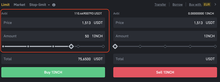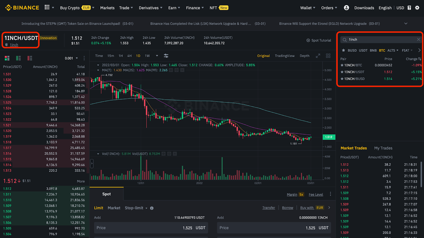 Du siehst jetzt den Markt-Bildschirm, auf dem du Markt-Order für den Handel mit 1INCH-Token setzen kannst. Die möglichen Trade-Pairs auf Binance sind 1INCH/BTC, 1INCH/USDT und 1INCH/BUSD.