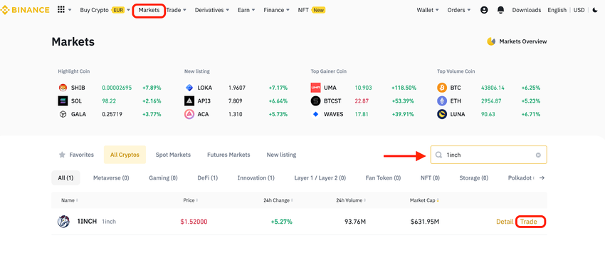 Wenn du nachschauen willst, wie der Markt zurzeit aussieht, klicke auf Market (im oberen Menüband) und suche nach 1INCH-Token. Klicke anschließend auf Trade.