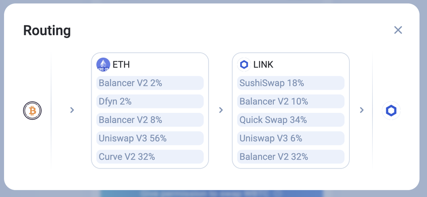 Das ist vor allem dann der Fall, wenn die Kryptowährung, die du tauschen willst, nicht zu den beliebtesten Assets gehört. Wenn du zum Beispiel wBTC in LINK umtauschen willst, könnte der beste Weg sein wBTC in ETH und dann in LINK zu tauschen. Insbesondere dann, wenn es keine Börse gibt, deren Liquiditätspools diese beiden Assets anbieten.