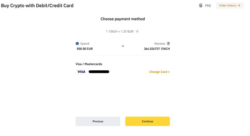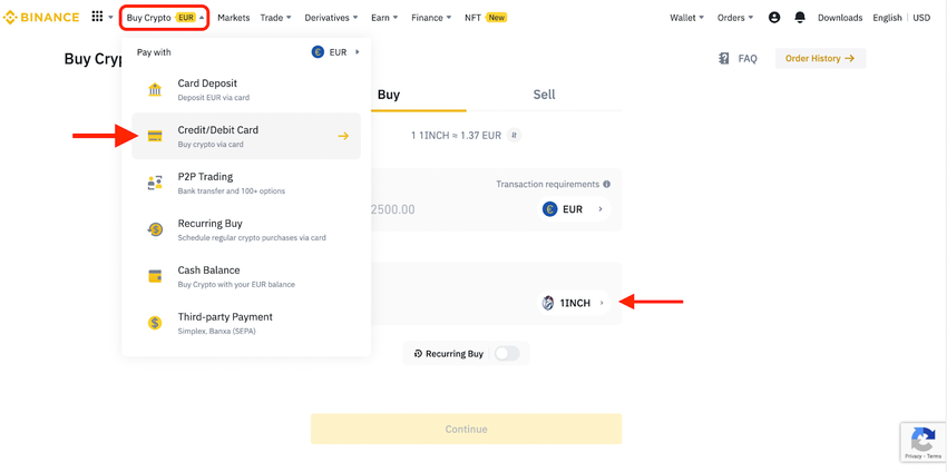 Nachdem dein Account verifiziert wurde, gehe auf Buy Crypto und wähle Credit/Debit Card aus. Hier kannst du deine Fiatwährung und die gewünschte Kryptowährung auswählen. In diesem Fall wählst du 1INCH, da du den Token sofort kaufen kannst.