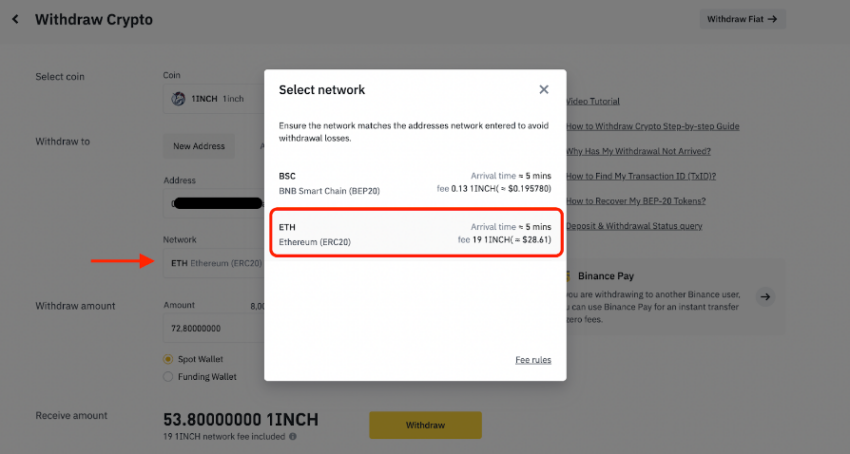 Beachte bitte, dass es sich hier um eine Blockchain-Transaktion handelt und das Ethereum Netzwerk hohe Gebühren erhebt. Binance wird dir die Netzwerkgebühren und den Betrag, den du erhalten wirst, klar anzeigen. Du kannst auf das Netzwerk klicken, um die genauen Gasgebühren in US-Dollar zu sehen. In diesem Fall sind die Gasgebühren bei 19 1INCH-Token (~ 28,61 US-Dollar) und die Transaktionszeit beträgt ungefähr fünf Minuten.