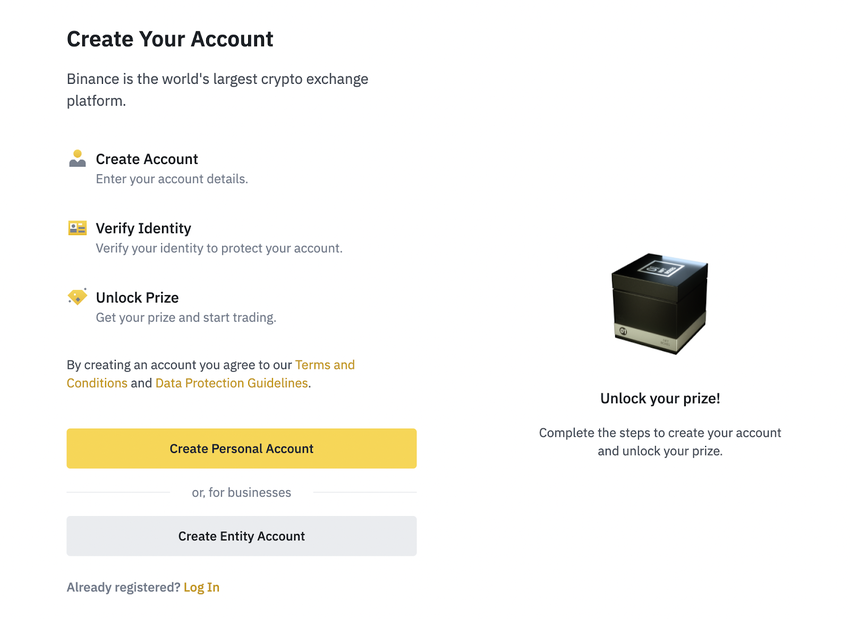 Das Erstellen eines Accounts auf Binance ist leicht und erfordert nur ein paar Klicks. Klicke auf Register und gib alle erforderlichen Informationen ein.