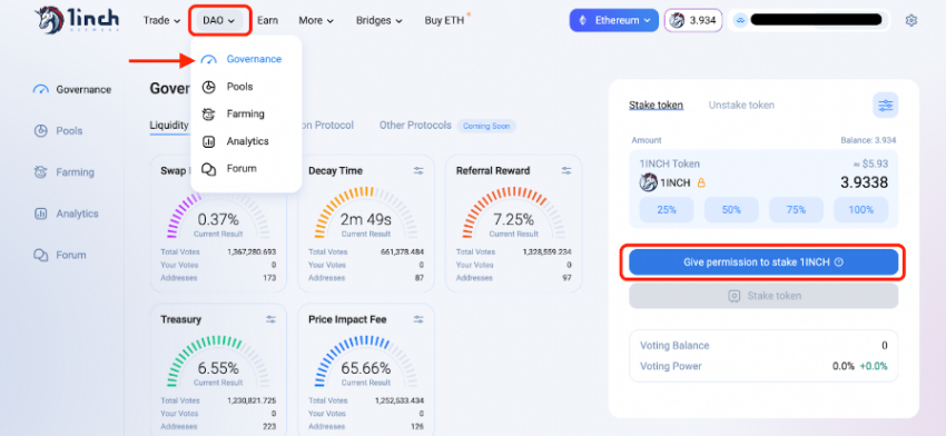Nachdem du deine Wallet mit der 1inch-App verbunden hast, wird dir die Möglichkeit zum Staken deiner Token angezeigt. Wähle einfach den Betrag, den du staken willst aus und klicke auf Give permission to stake 1INCH.
