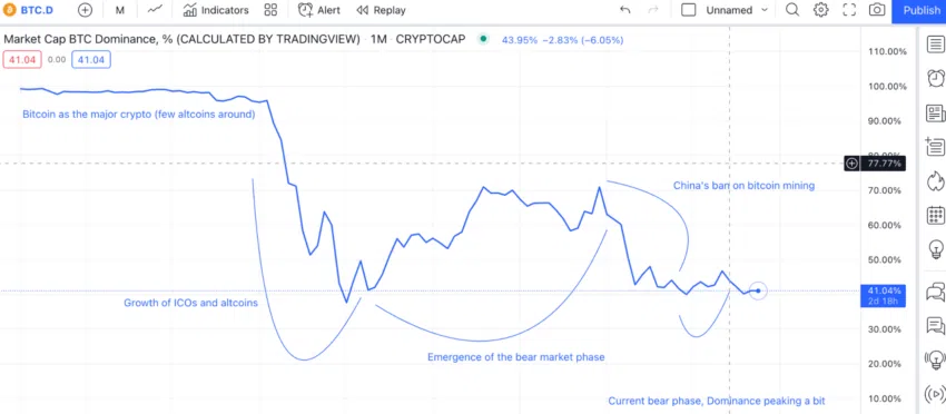 Doch zuerst etwas Perspektive! Wie erwähnt, war Bitcoin die erste Kryptowährung überhaupt. Sie wurde 2009 eingeführt und hielt damals 100 % des Kryptomarktanteils. Mit der Zeit tauchten andere Akteure auf. Litecoin, Ethereum und eine Flut von anderen Altcoins. Folglich begann die Bitcoin-Dominanz zu sinken. Nichtsdestotrotz dient Bitcoin weiterhin als Nummer eins Kennzahl zur Verfolgung der Gesamtmarktkapitalisierung. Anders ausgedrückt: Je mehr Token auf dem gesamten Markt effektiv Bitcoin sind, und desto verbreiteter ist die Anwendung, desto ‘dominanter’ ist Bitcoin. Dabei geht es auch um das subjektive Empfinden der Community wie etwa die Beliebtheit und das Vertrauen in seinen Wert.