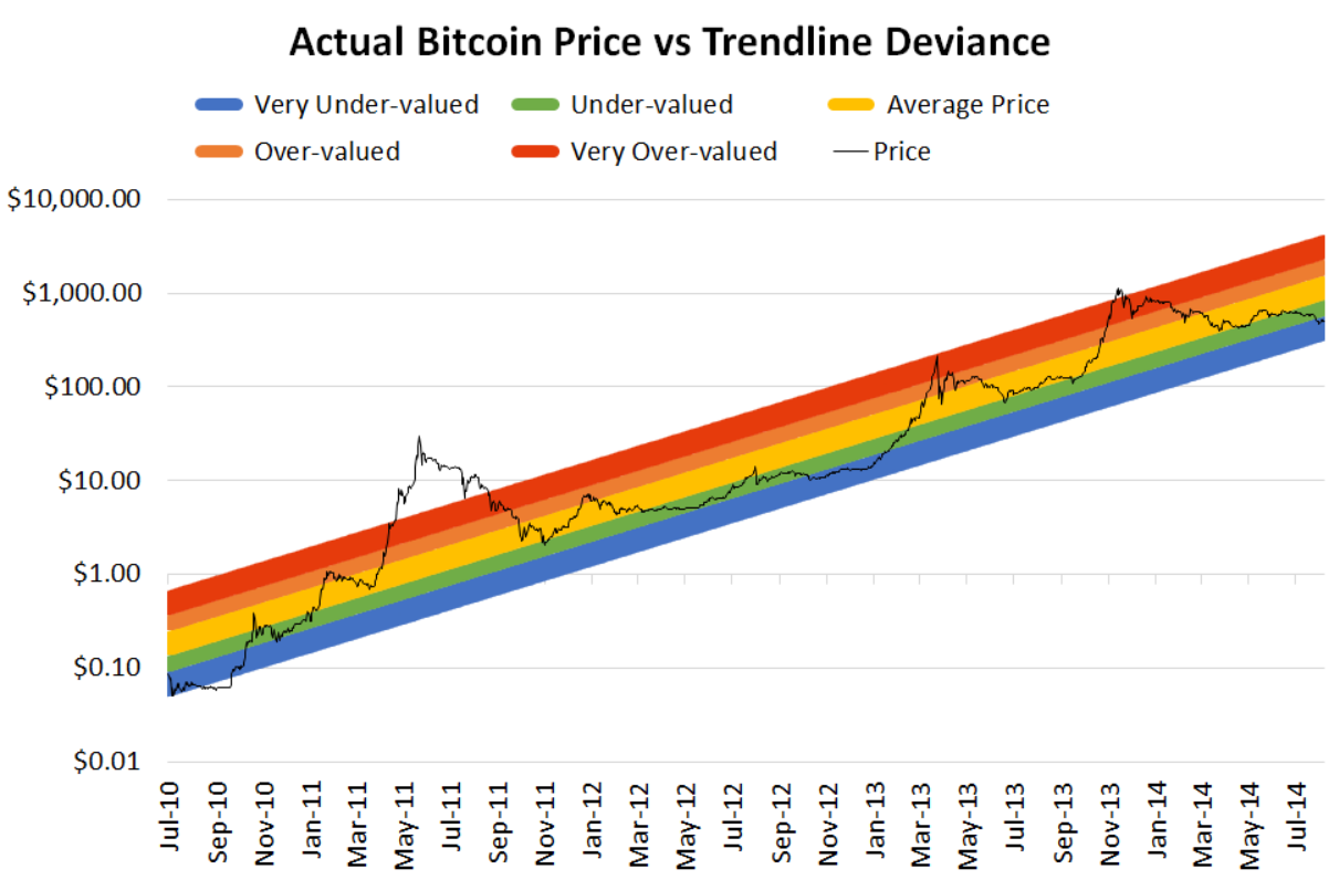 Es begann als lustiges Diagramm, zog aber schnell die Blicke auf sich. Als das Diagramm populär wurde, hat Trolololo es 2014 mit der logarithmischen Regression gepaart und ihm damit Form und Zweck verliehen (ein Bitcointalk-Nutzer).