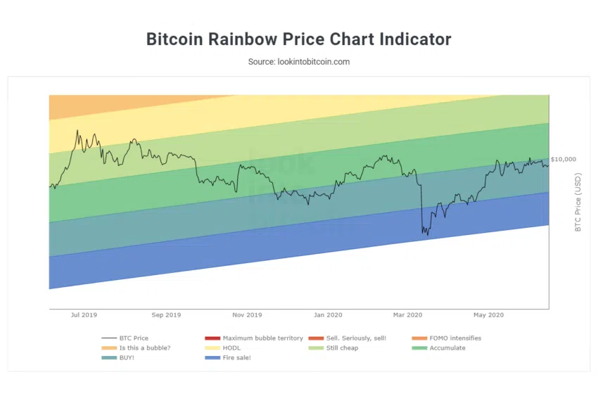 Dieses anlegerfreundliche Tool, das auch als BTC-Rainbow-Chart bezeichnet wird, ist vollgestopft mit historischen Preisbewegungen, bunten Bändern und absolut null Toleranz für Volatilität. Zugegeben, der letzte Punkt ist vielleicht etwas übertrieben. Aber der Bitcoin-Regenbogen-Chart bietet eine unverfälschte Darstellung des BTC-Kurses und lässt die tägliche Volatilität außen vor. Und es verwendet darüber hinaus ein statistisches Modell, was seine Glaubwürdigkeit als zuverlässiges Tool zur Bewertung des Bitcoin-Kurses umso mehr unterstreicht.