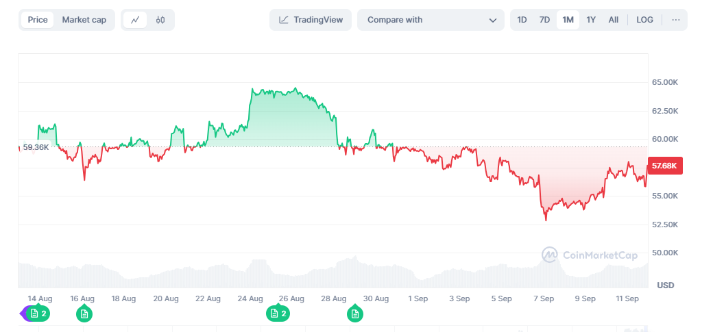 Mit DCA nutzt der Anleger die Vorteile der Marktvolatilität, indem er das Risiko verteilt. Am 11. September 2024 beispielsweise bewegte sich der BTC-Kurs innerhalb von 30 Tagen in einem Bereich von 52 bis 64 USD.