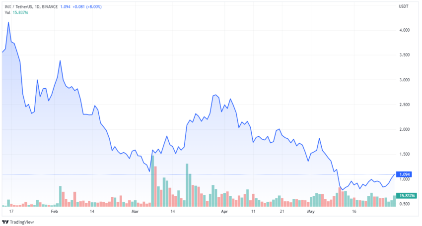 Das Gesamtangebot des IMX Token beläuft sich auf 2 Milliarden Token, wovon momentan rund 235 Millionen IMX Token im Umlauf sind. Zurzeit liegt der IMX Kurs bei 1,08 US-Dollar, mit einer Marktkapitalisierung von 224 Millionen US-Dollar.